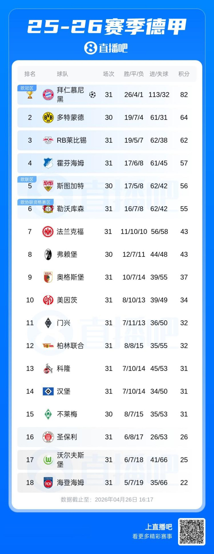 直播吧04月26日讯德甲第31轮,沃尔夫斯堡0-0战平门兴,近14轮联赛仅取得一场胜利,继续排名德甲倒数第二。